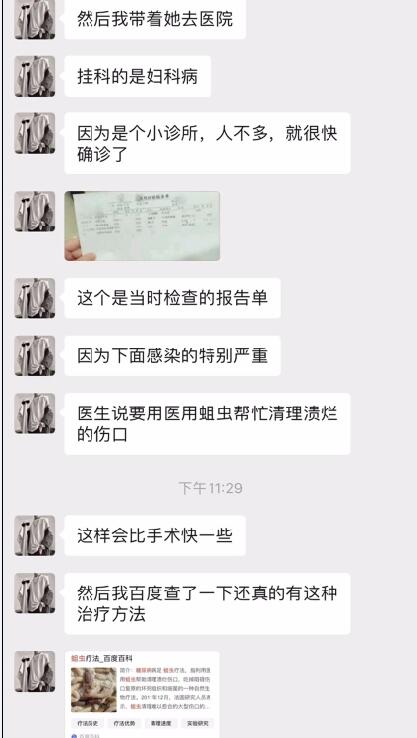 疑似1118视频事件女主的男朋友爆料,称视频是女生不小心发出去的 女生得了妇科病,本来是为了用蛆清理溃烂的伤口 这也不知道是真是假?